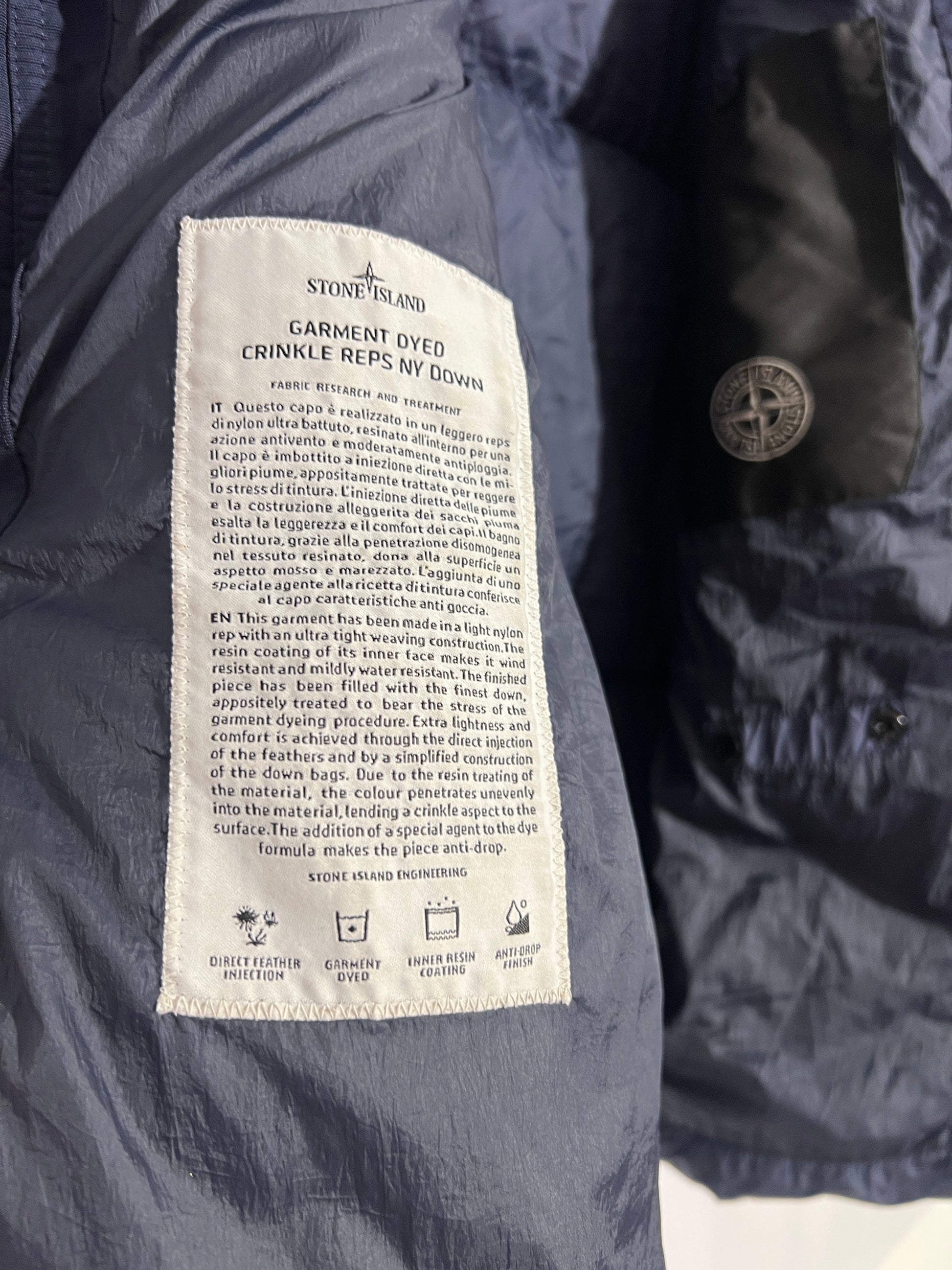Questo capo è realizzato in un leggero reps di nylon ultra battuto, resinato all’interno per un’azione antivento e moderatamente antipioggia. Il capo è imbottito a iniezione diretta con le migliori piume, appositamente trattate per reggere lo stress di tintura. L’iniezione diretta delle piume e la costruzione alleggerita dei sacchi esalta la leggerezza e il comfort dei capi. Il bagno di tintura, grazie alla penetrazione disomogenea nel tessuto resinato, dona alla superficie un aspetto mosso e marezzato. L’aggiunta di uno speciale agente alla ricetta di tintura conferisce al capo caratteristiche anti goccia.